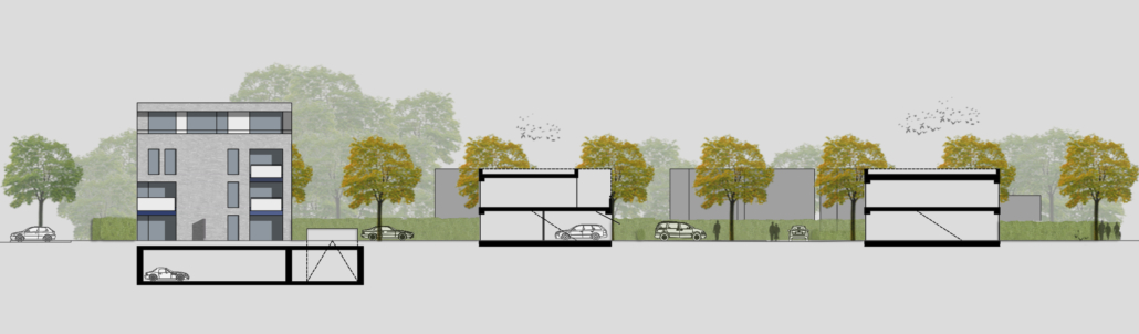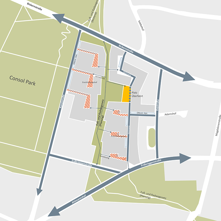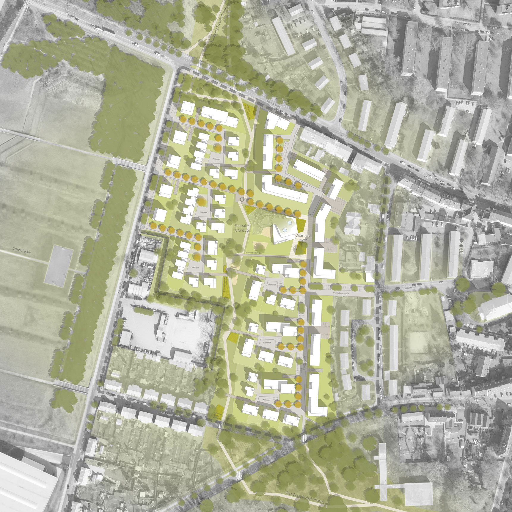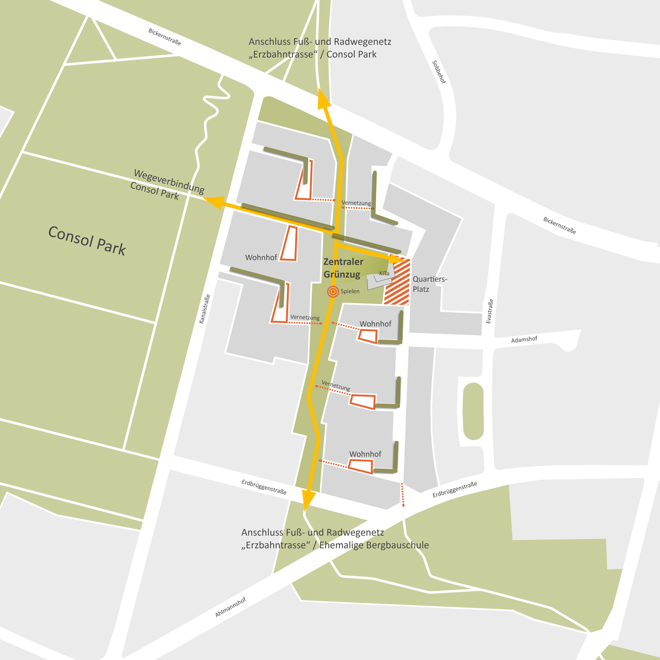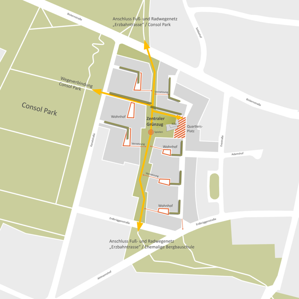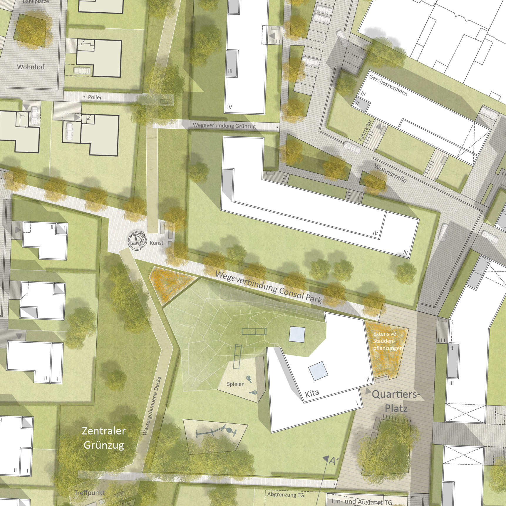 Der Entwurf umfasst zwei unterschiedlich geprägte Wohnquartiere. Im Osten bestimmt eine überwiegend dreigeschossige Straßenrandbebauung mit ergänzenden Wohngruppen das Bild. Das westliche Quartier ist durch viergeschossige Stadthäuser entlang der Kanalstraße mit offenem Übergang zum Consolpark geprägt. Wohnwege erschließen weitere Wohngruppen; am Grünzug ist eine Kindertagesstätte vorgesehen.