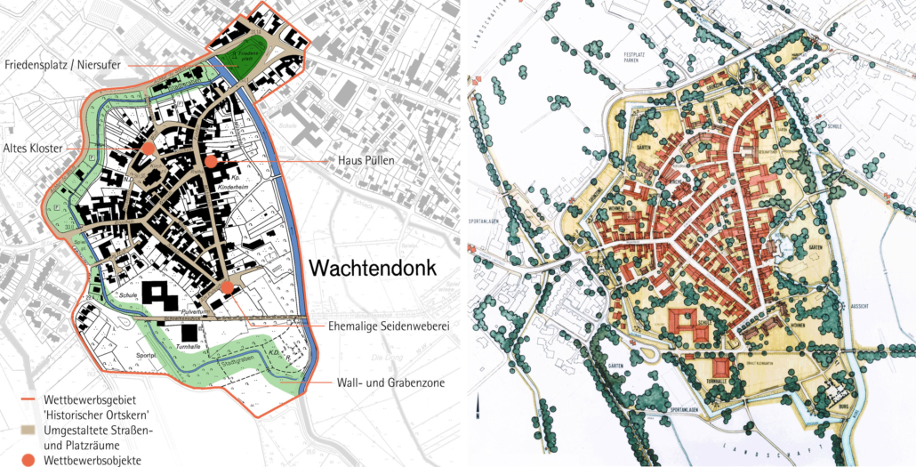 Ein mittelalterlicher Stadtgrundriss und zahlreiche Baudenkmäler prägen den historische Ortskern. Auf der Grundlage der Wettbewerbsergebnisse von 1985 hat die STADTRAUM Architektengruppe einen Rahmenplan entwickelt, der vor allem der Sicherung und Weiterentwicklung der historischen Bausubstanz und der Stadtstruktur diente. Sanierungsgebiete, Denkmalbereichssatzung und eine Gestaltungssatzung waren die zentralen Planungsinstrumente. 1989 wurde Wachtendonk in die Liste der Historischen Ortskerne NRW aufgenommen.